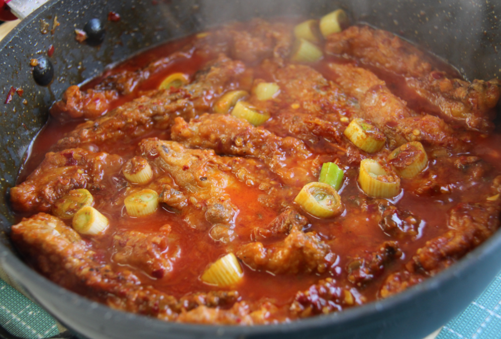 4. 鍋內放入菜籽油,加入姜沫煸炒出香味,加入清水、鮮椒牛肉醬,燒開后倒入炸好的魚塊,煮3-4分鐘;